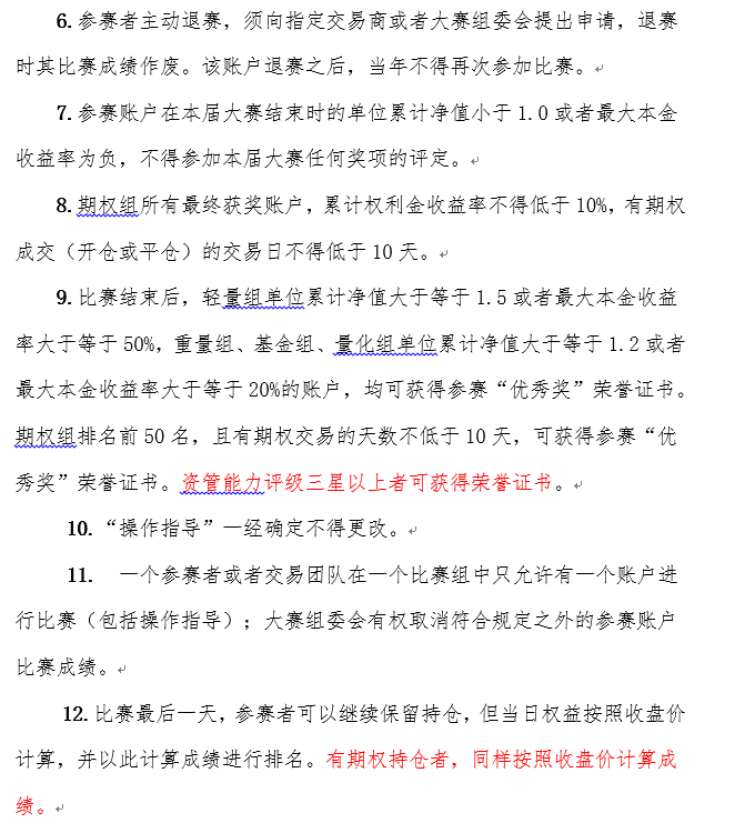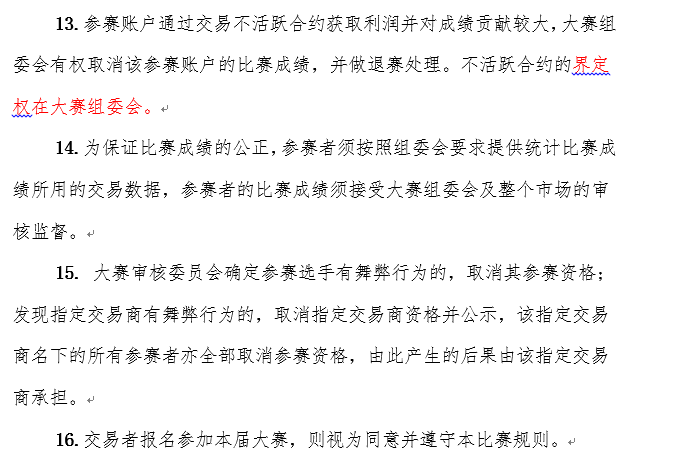 長(zhǎng)期穩(wěn)定盈利 | 1000元以上 | 同一參賽者的同一參賽賬號(hào)的多屆參賽成績(jī),系統(tǒng)自動(dòng)統(tǒng)計(jì)。同一參賽者的不同參賽賬號(hào)的多屆成績(jī),須參賽者自行在大賽官網(wǎng)進(jìn)行成績(jī)合并,或者向指定交易商、組委會(huì)申報(bào)賬戶合并。 | 必須參加第十五屆比賽才有資格進(jìn)行該獎(jiǎng)項(xiàng)評(píng)定,通過(guò)第三屆大賽以來(lái)的歷屆參賽名次換算綜合得分。同一屆比賽不同組別的多個(gè)獎(jiǎng)項(xiàng),成績(jī)不累計(jì),可取最好成績(jī)。 |